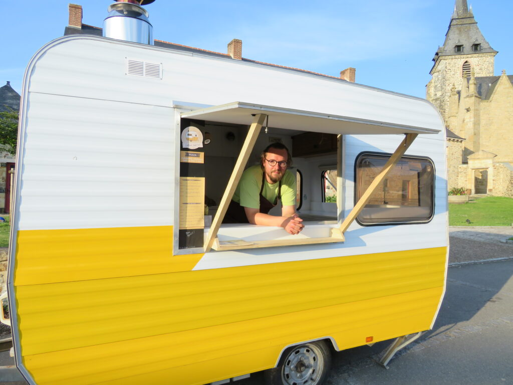 Kevin, nouvel artisan de Bais, vous propose des pizzas cuites dans un four à bois depuis son Food-truck ‘’L’atelier Enfariné’’ aux allures des plus originales : une caravane jaune et blanche.